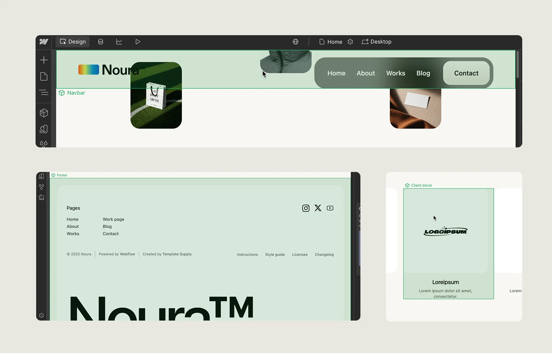 Components are reusable elements in Webflow that let you maintain consistency across multiple pages. When you update a component, the changes automatically apply wherever it’s used. In this template, elements like the navbar, footer, and other repeated sections are built as components. You can recognize a component by the green outline that appears when you select it in the Designer. To edit the elements of a component, you need to double-click it to make your changes.